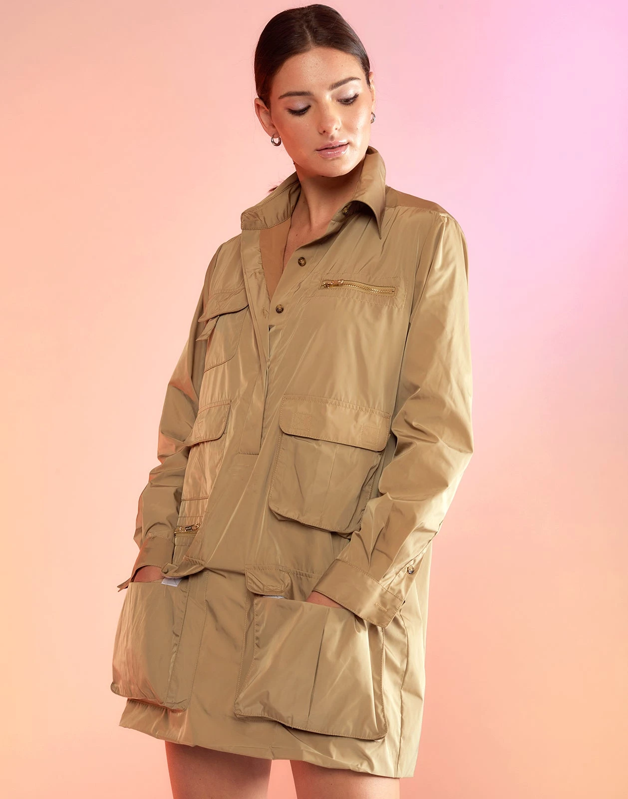 Utility jacket inspired dress with patch pockets.Â