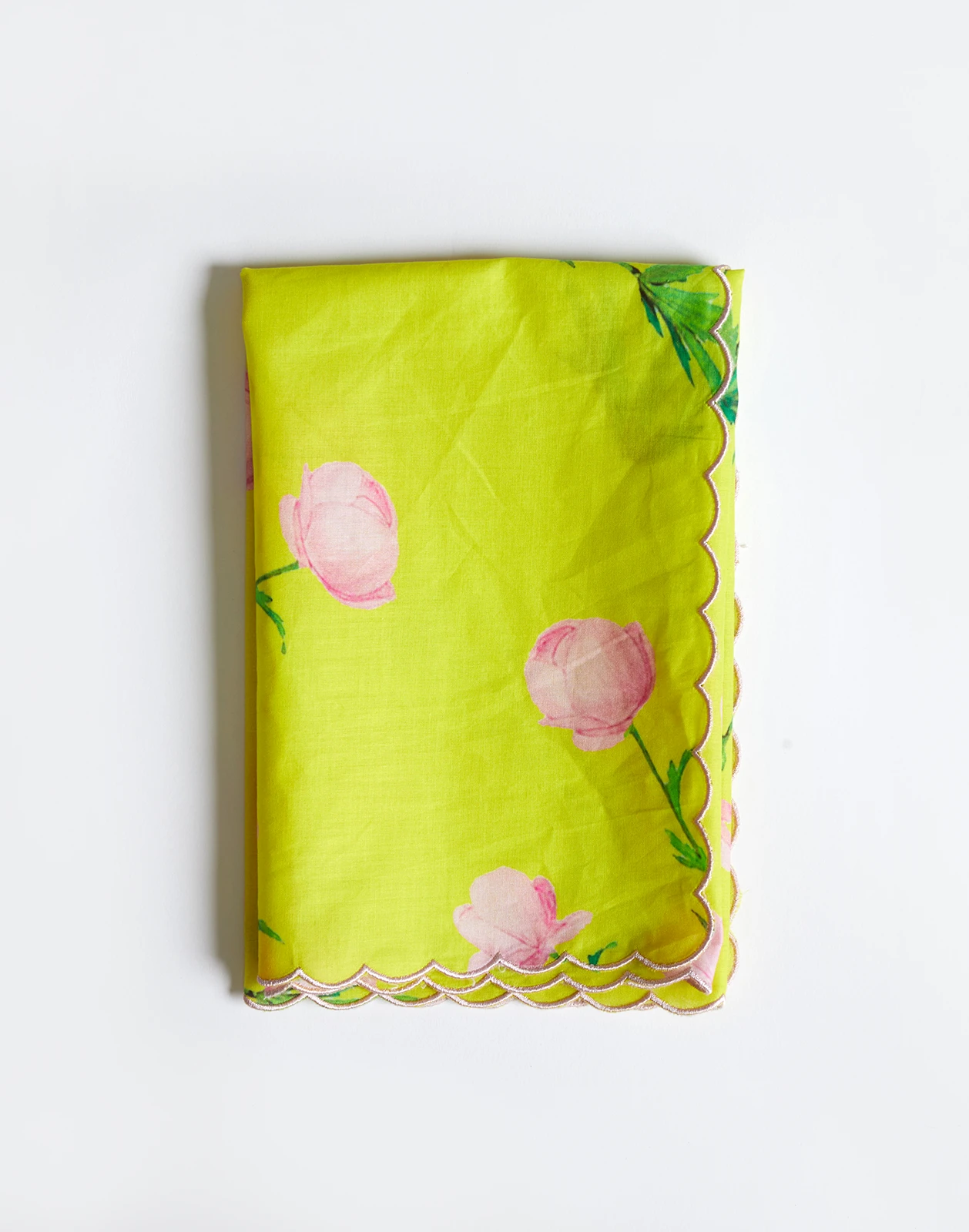 Printed cotton dinner napkins with scallop embroidered edge.Â