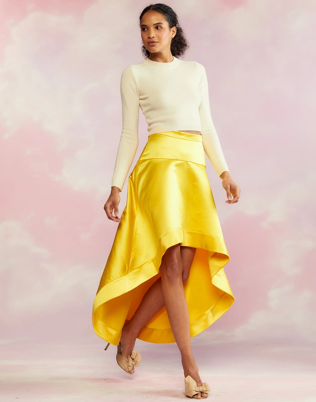 Yellow satin high low skirt.