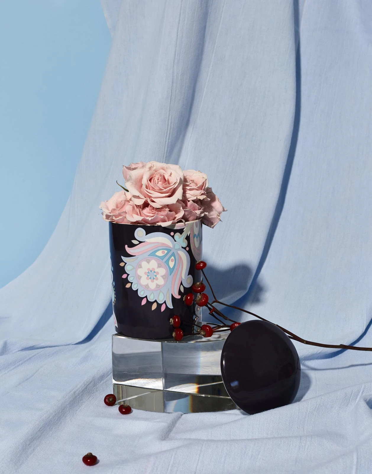 The design of Moonflower features pastel florals on a navy background paired with the fragrance No. 27, of Bulgarian rose and blackcurrant to elevate your mood and set a sophisticated tone to your day.