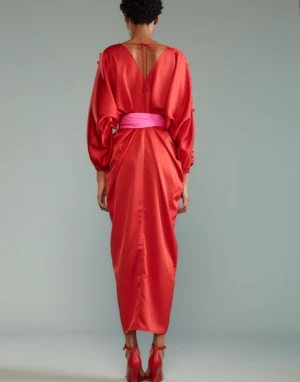– Oversized dolman sleeve with draping silhouette, small ruffle detail along sleeve length