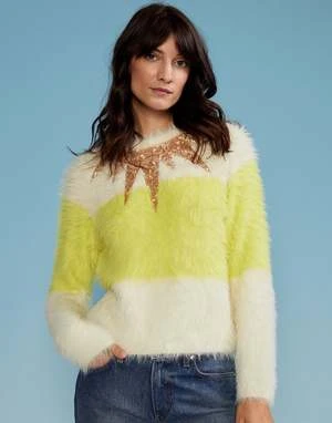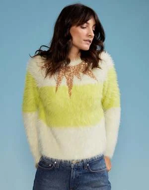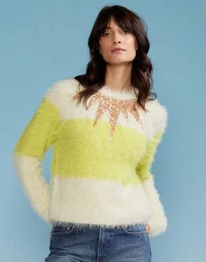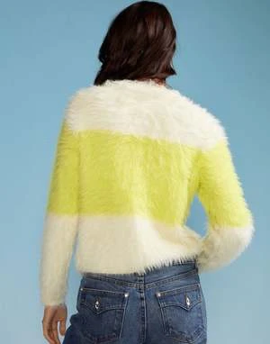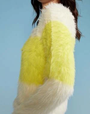 Super soft, cozy, and fuzzy striped crewneck sweater.