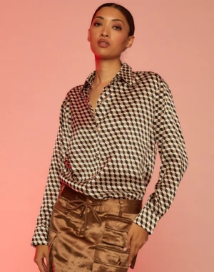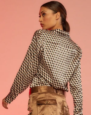 Silk long sleeve button down shirt with all over graphic print.