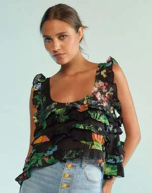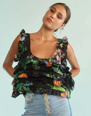 Black floral cotton ruffle tank.