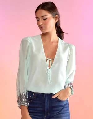 Airy silk blouse with sequin sleeve detail.